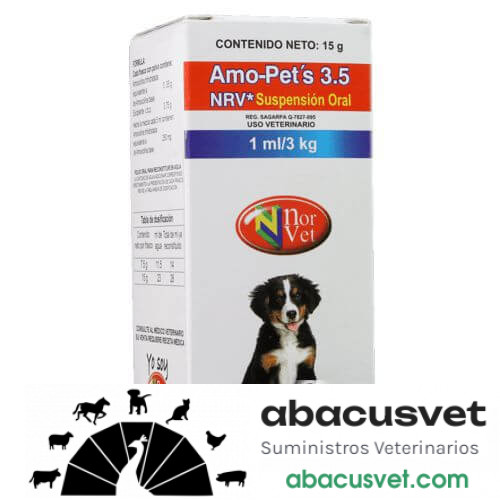 AMO-PETS 3.5 NRV Susp. Oral 15 g frasco de 15 gr marca Norvet para: De 10 a 20 mg/ kg de peso corporal, equivalente a 5 ml por 15 kg de peso. Cada 12 horas durante 5 a 7 días.