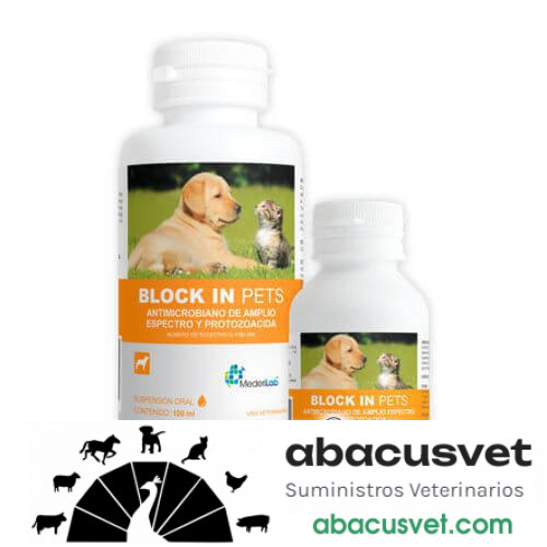 Block in pets frasco de 100 ml marca Mederilab para: Para el tratamiento de diarreas infecciosas causadas por bacterias sensibles a la fórmula como: Giardia, E. coli, Salmonella spp, Enterobacter aerogenes, Klebsiella spp, Pseudomona aureoginosa, Proteus spp. ¡Compra en línea – abacusvet.com!