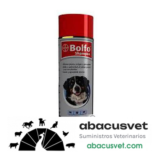 Ingrediente activo: Propoxur al 0.1%. Bolfo shampoo es de alta calidad y pH ajustado, diseñado especialmente para la delicada piel del perro y el gato con un contenido de 100 mg de propoxur. El shampoo ectoparasiticida Bolfo shampoo es de aplicación tópica, dando masaje a la piel mojada del animal hasta obtener abundante espuma; se deja reposar de 3 a 5 minutos y posteriormente se enjuaga al animal y se repite la operación. Administre la cantidad de shampoo necesaria para lograr una espuma abundante. A continuación seque al animal. Para uso exclusivo del Médico Veterinario Zootecnista.