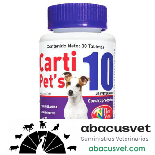 Carti pet’s 10, tabletas orales. Glucosamina, Condroitin y Ácido Hualuronico combinado con Gingko Biloba Ginseng, Ácidos Grasos, Vitaminas, Minerales y Antioxidantes. ADVERTENCIAS: No administrar a animales con hipersensibilidad a cualquiera de los componentes de la fórmula. Mantenga este producto en un lugar fresco, seco y protegido de la luz. No se deje al alcance de los niños y animales domésticos. Consulte al Médico Veterinario. Para uso exclusivamente Veterinario.