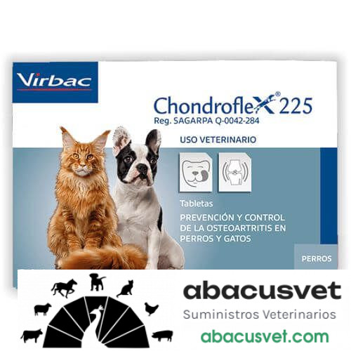 Chondroflex ® 225 está indicado como auxiliar en el tratamiento de la osteoartritis en perros y gatos de razas susceptibles, pacientes geriátricos o con obesidad. El sulfato de condroitina es un constituyente de la estructura cartilaginosa. El quitosán, es un precursor de la glucosamina que forma parte de la composición del cartílago. Además ejerce un efecto protector sobre la condroítina sulfato, evitando su degradación en el tracto digestivo facilitando su absorción intestinal.