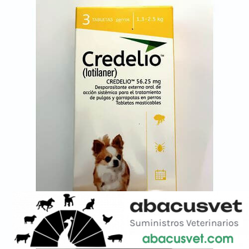 Ingrediente activo: Cada tableta de 160 mg contiene: Lotilaner 56.25 mg. Excipientes c.s.p 1 tableta. Para uso oral. CREDELIO debe ser administrado a una dosis de 20 a 43 mg/kg de peso corporal. La tableta Credelio 56.25 mg es para perros de 1.3 a 2.5 kg de peso. CREDELIO es una tableta masticable saborizada. Administre CREDELIO una vez al mes con o después de la comida.