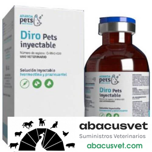 Diro Pet Inyectable frasco de 20 ml marca Aranda para: Antiparasitario indicado en caninos y felinos (cachorros mayores de 6 semanas) para el tratamiento de infestaciones causadas por nemátodos gastroentéricos (Dirofilaria immitis, Toxocara canis, T. cati, Ancylostoma caninum, Capillaria spp., Filaroides hirthi, Oslerus osleri, Trichuris vulpis), cestodos (Taenia hydatigena, T. pisiformis, T. taeniaeformis, Dipylidium caninum, Mesocestoides corti, Echinococcus granulosus), ectoparásitos (Sarcoptes scabiei, Otodectes cynotis y Pneumonyssoides caninum), pulmonares, renales y microfilarias. ¡Compra en línea – abacusvet.com!