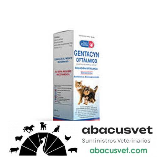 Gentacyn Oftálmico frasco de 10 ml marca Pets Pharma para: Está indicado en el tratamiento tópico de las infecciones de las estructuras oculares y sus anexos causadas por bacterias susceptibles. Estas infecciones incluyen: conjuntivitis, queratitis y queratoconjuntivitis, úlceras cornéales, blefaritis y blefaroconjuntivitis. Puede usarse en la prevención de la infección ocular después de la extracción de cuerpos extraños de la córnea o de la conjuntiva, después de traumatismo producido por agentes químicos o físicos y después de cirugía oftálmica. ¡Compra en línea – abacusvet.com!