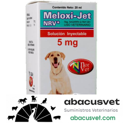 Meloxi-Jet NRV 5 mg frasco de 20 ml marca Norvet para: Producto antiinflamatorio, analgésico y antipirético no esteroideo. Es un inhibidor selectivo de la COX-2 y condroprotector. Útil en el tratamiento del dolor secundario de traumatismos, reducción de la inflamación y dolor post-operatorio en cirugías ortópedicas y de tejidos blandos. ¡Compra en línea – abacusvet.com!