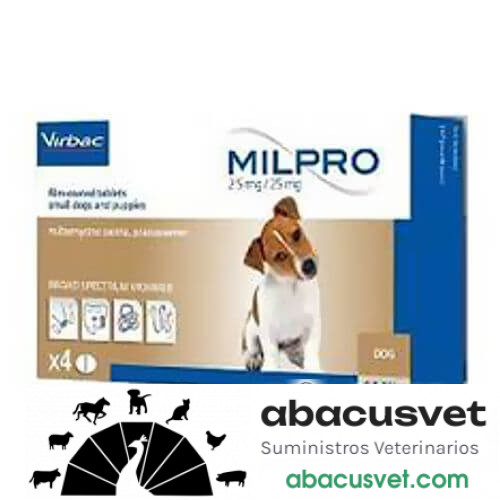 MILPRO, antiparasitario interno para tenias y gusanos redondos, en comprimidos palatables recubiertos. Para perros menores de 5 kg. No apto en cachorros menores a 2 semanas y/o de 0.5 kg o en gatos. No debe usarse en caso de hipersensibilidad a las sustancias activas. El producto puede ser usado en perras lactantes, hembras preñadas y perras reproductoras, a recomendación del Médico Veterinario.
