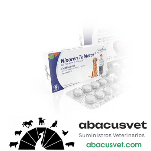 Ingrediente activo: Cada tableta contiene:Enrofloxacina 50 mg .Dosis:nixoren-150® caninos: 1 tableta / 30 kg de peso corporal. la dosis debe repetirse cada 24 horas, a criterio del médico veterinario.Vía de administración:Oral.