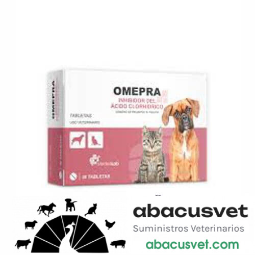 OMEPRA Inhibidor del ácido clorhídrico caja con 30 tabletas de 10 mg marca Mederilab para: Para el tratamiento de hiperacidez gástrica, úlceras del tracto digestivo (gástricas y duodenales), gastritis crónica, esofagitis (reflujo gastro esofágico) y en general aquellos estados de hiperclorhidria gástrica en donde se requiera un control efectivo del ácido clorhídrico en el estómago. Consulte al Médico Veterinario. Su venta requiere receta médica. ¡Compra en línea – abacusvet.com!
