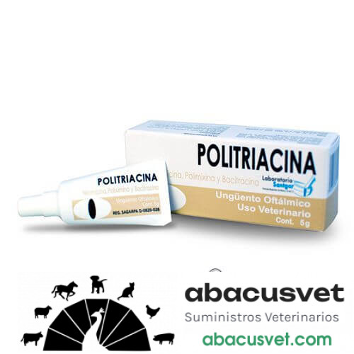 POLITRIACINA Neomicina, polimixina, Bacitracina pieza de 5 gr marca Santgar para: La primera opción en el tratamiento de las infecciones de la superficie ocular de los perros. Es el triple antibiótico que representa la combinación ideal para una terapia antibiótica reforzada, de acción prolongada y con excelente distribución sobre la superficie ocular. ¡Compra en línea – abacusvet.com!